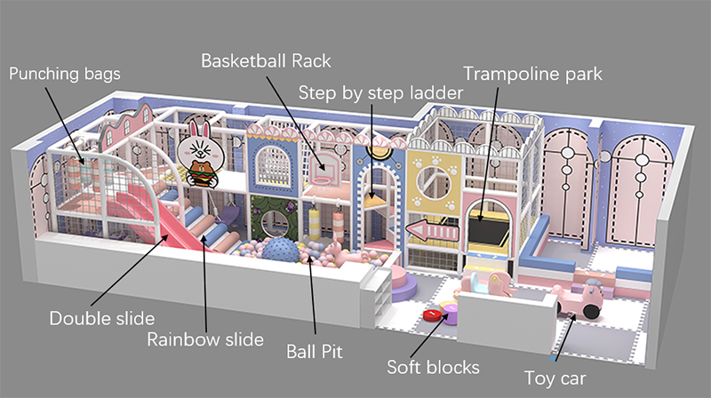 This is a small indoor playground covering approximately 100 square meters. It is filled with various elements like plastic slides, rainbow - colored climbing ladders, punching bags, basketball hoops, trampolines, a ball pit, and soft - play areas. With bright colors, it is perfect for small - scale spaces such as family homes, kindergartens, and shopping malls and ect.